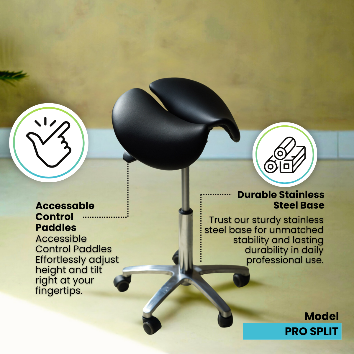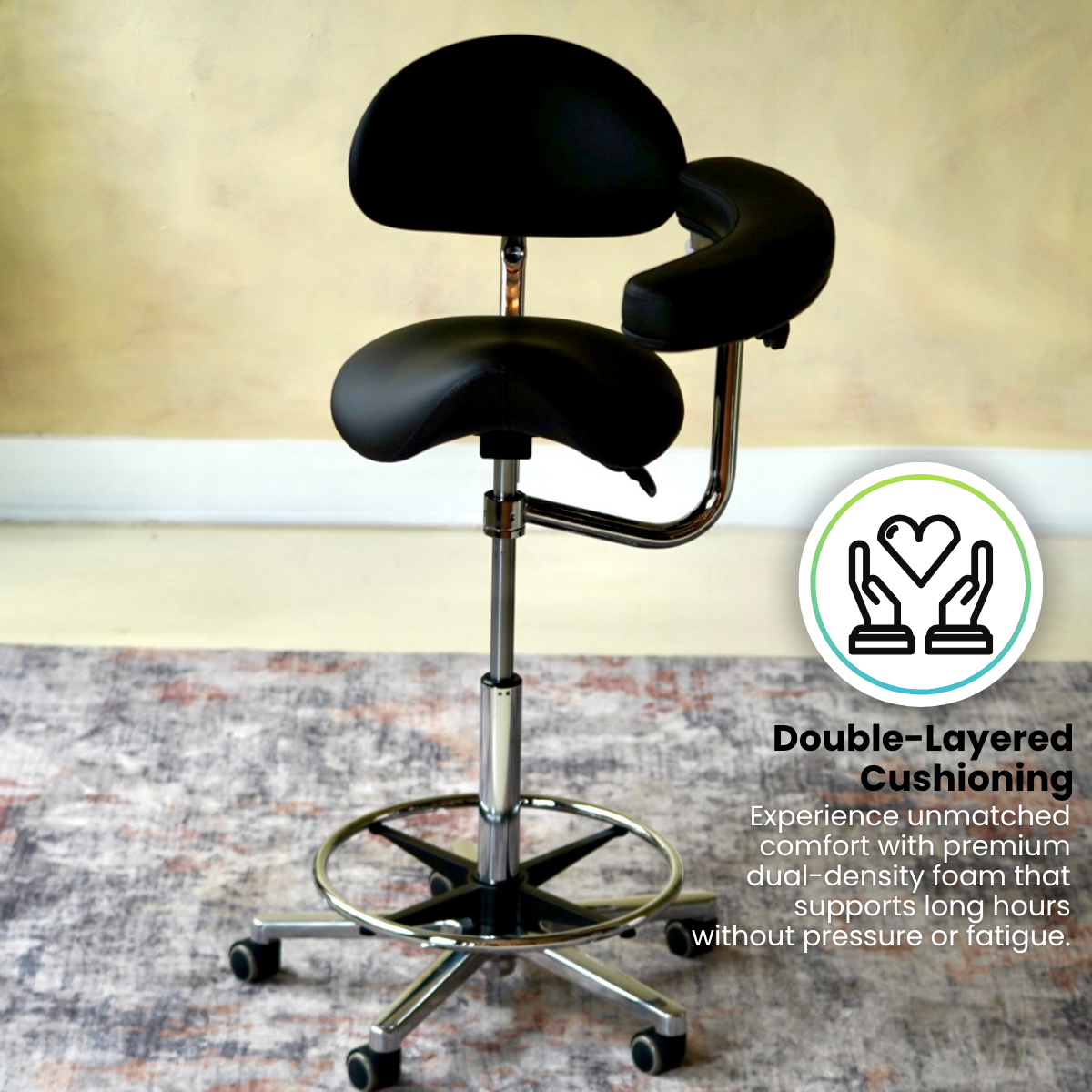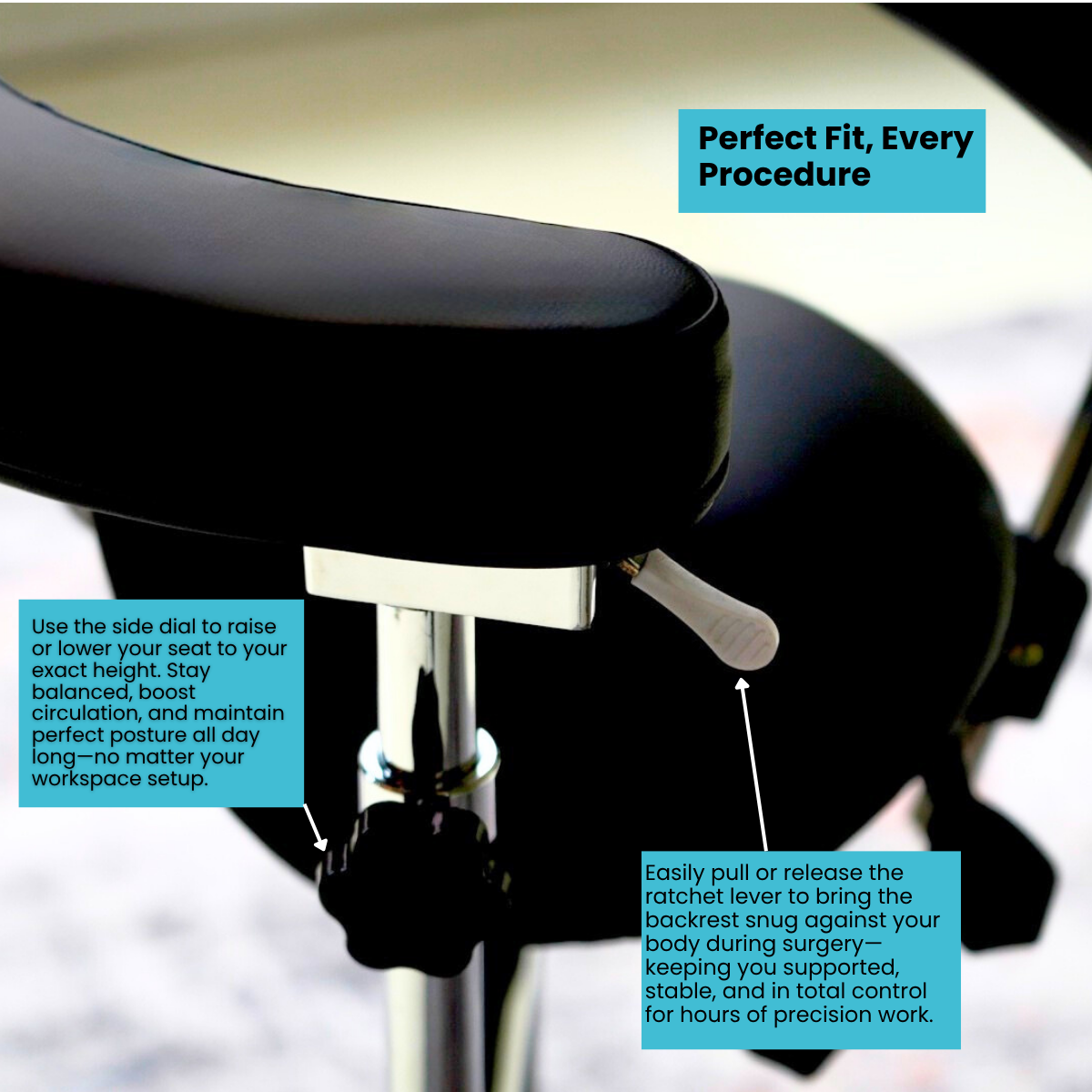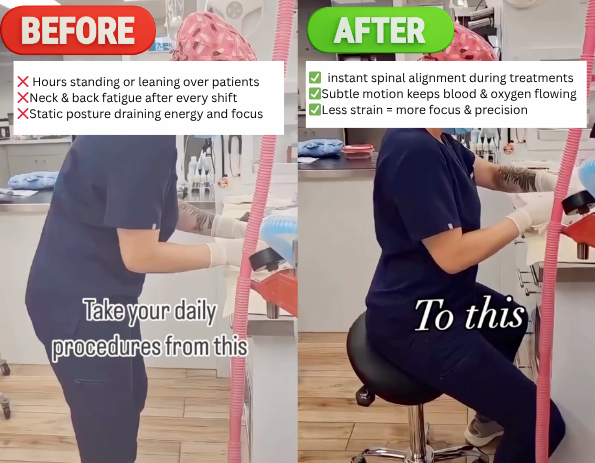 Our saddle stool keeps your spine aligned during long procedures, reduces neck and back strain, and helps you stay sharp and comfortable through every shift.