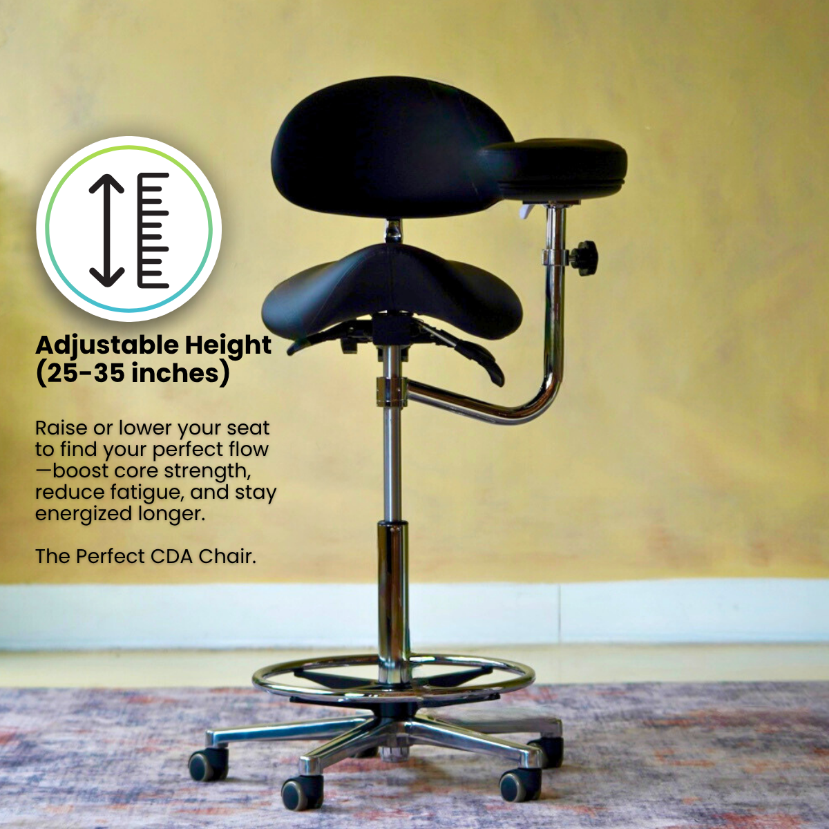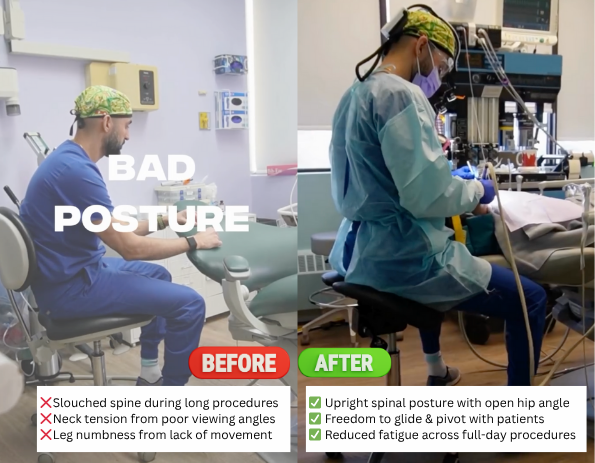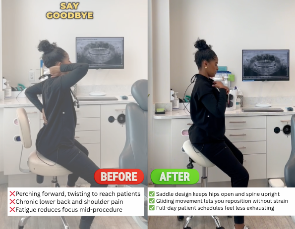 Traditional chairs force dental pros into twisted, rounded positions. Our saddle stools reopen your hips, align your spine, and keep you energized — even through your busiest patient days.