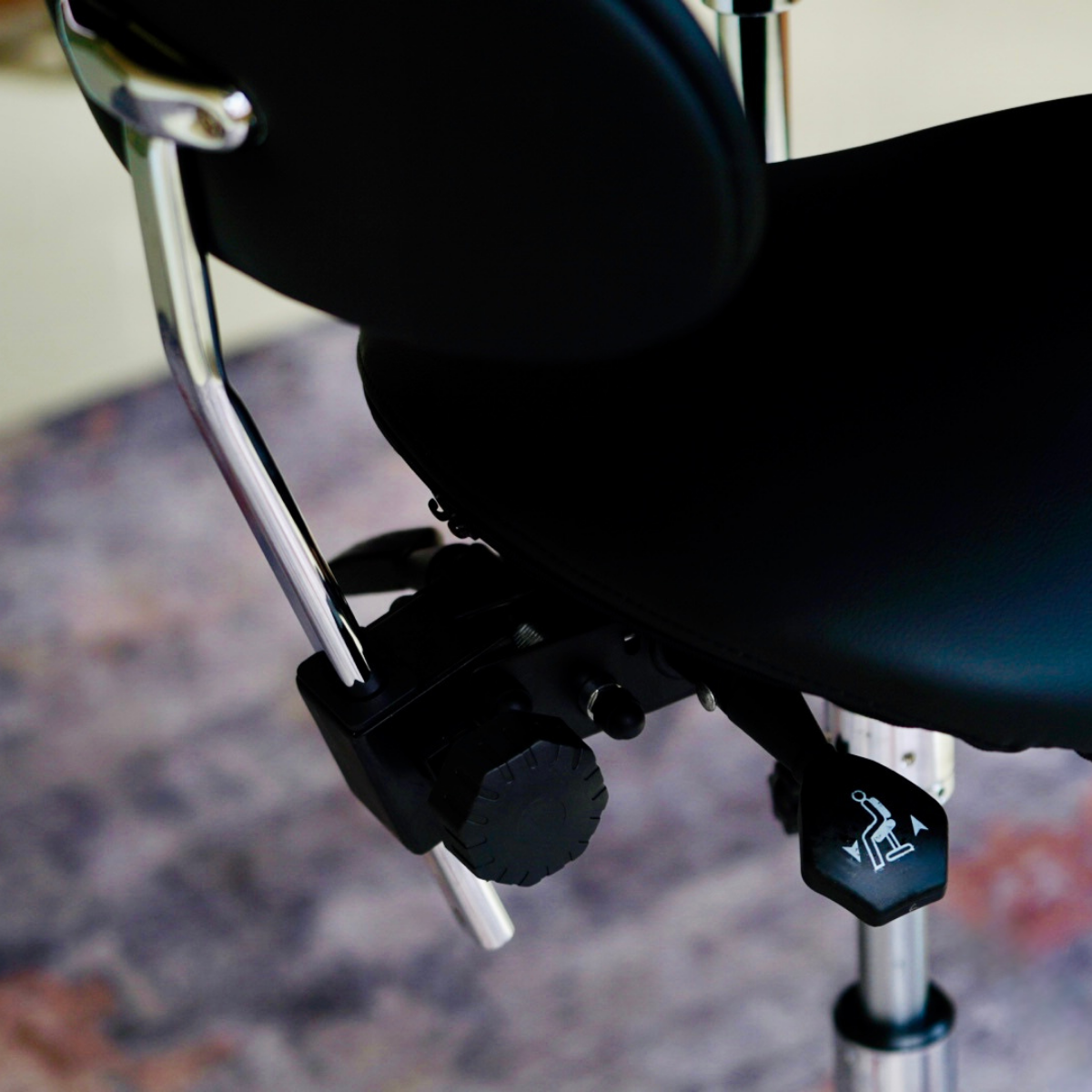 The saddle seat maintains your spine’s natural S-curve, reducing spinal compression by up to 80% compared to standard flat chairs.