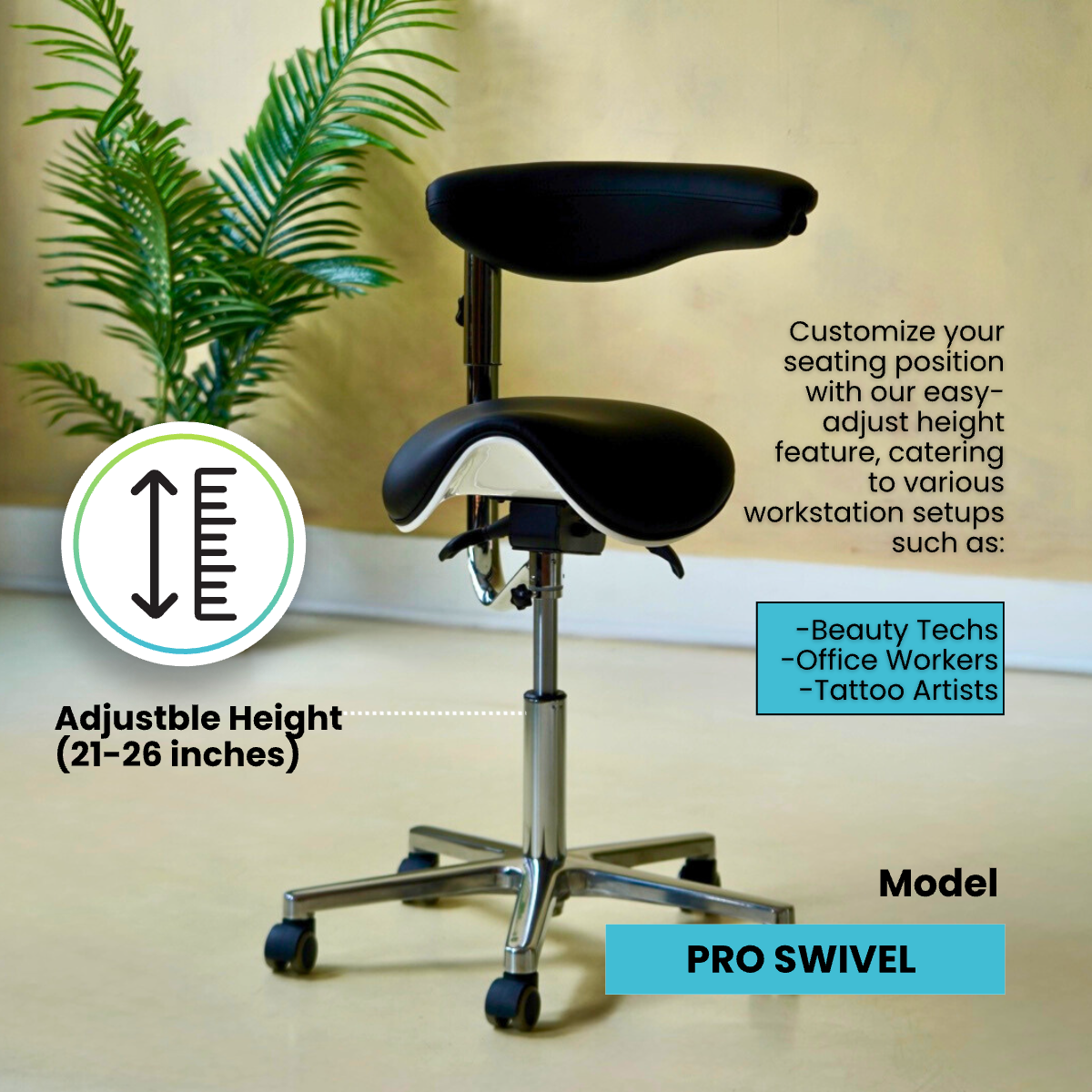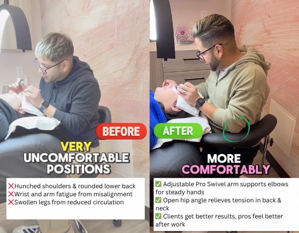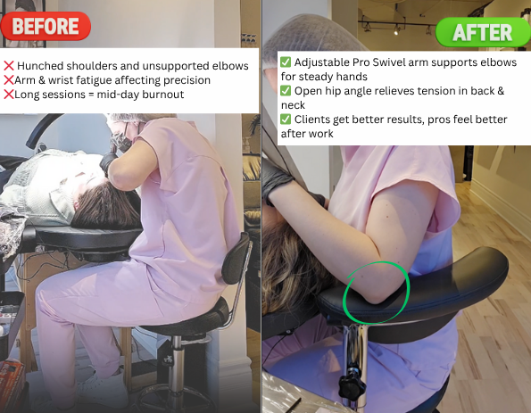 The Pro Swivel supports your elbows and keeps your posture upright, helping you work steadier, longer, and with less strain — so your clients get better results and you feel better after every appointment.