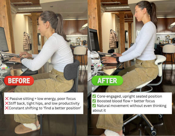 Light core engagement during active sitting keeps postural muscles firing — preventing weakness and pain from prolonged inactivity.