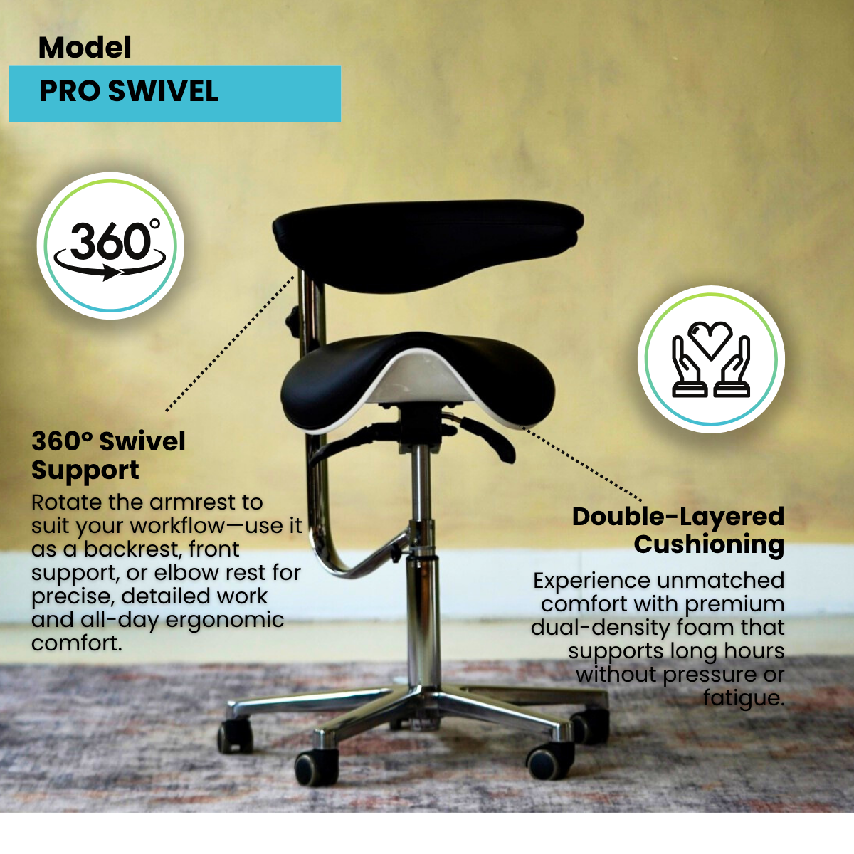 The Pro Swivel supports your elbows and keeps your posture upright, helping you work steadier, longer, and with less strain — so your clients get better results and you feel better after every appointment.
