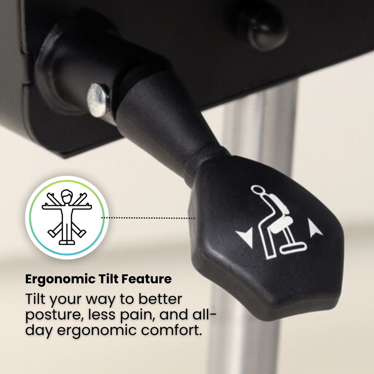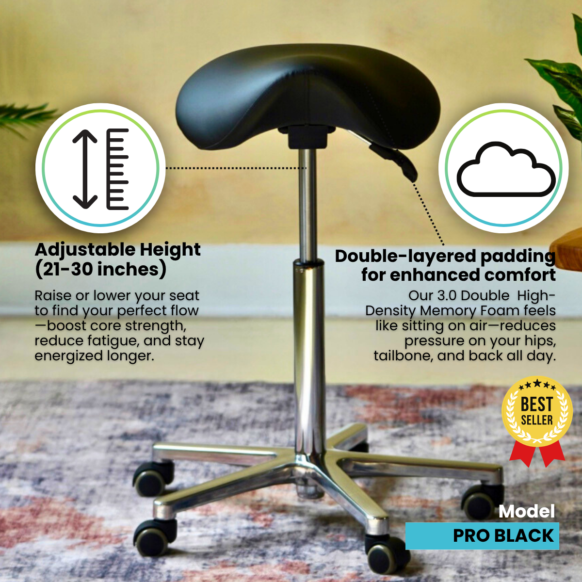 The saddle seat maintains your spine’s natural S-curve, reducing spinal compression by up to 80% compared to standard flat chairs.